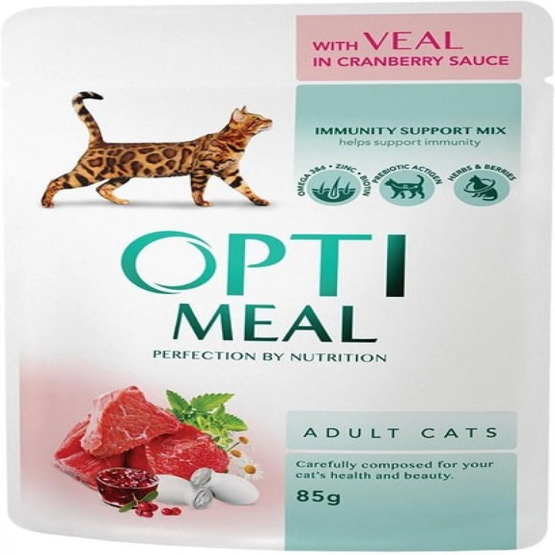 Упаковка повнораціонного консервованого корму Optimeal для дорослих котів з телятиною у журавлиновом 259.0 ₴ |